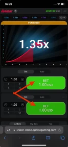 The ability to make 2 bets at once during the game for 1n round. This allows players to increase their chances of big wins, as well as in one round to test different betting strategies. Thanks to 2 different bets, the player can bet different amounts and thus increase the possibility of catching the plane at high odds with a large bankroll.